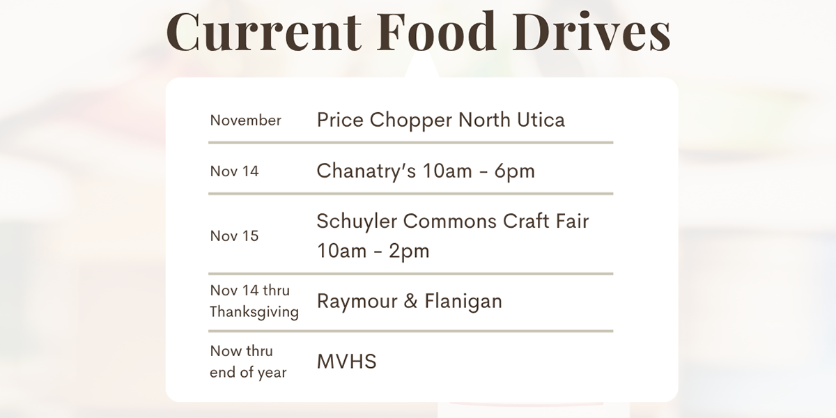 Several community partners are helping fill our shelves this holiday season. You can support the Utica Food Pantry in the following ways: